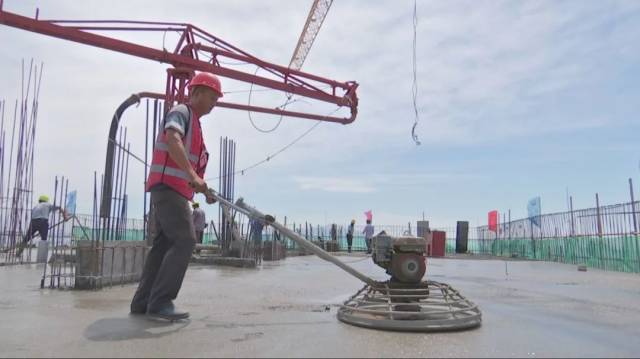 施工人员唐家凌告诉记者,“热是肯定热,但是为了工程进度,辛苦一点没事。封顶了,大家都非常开心。”