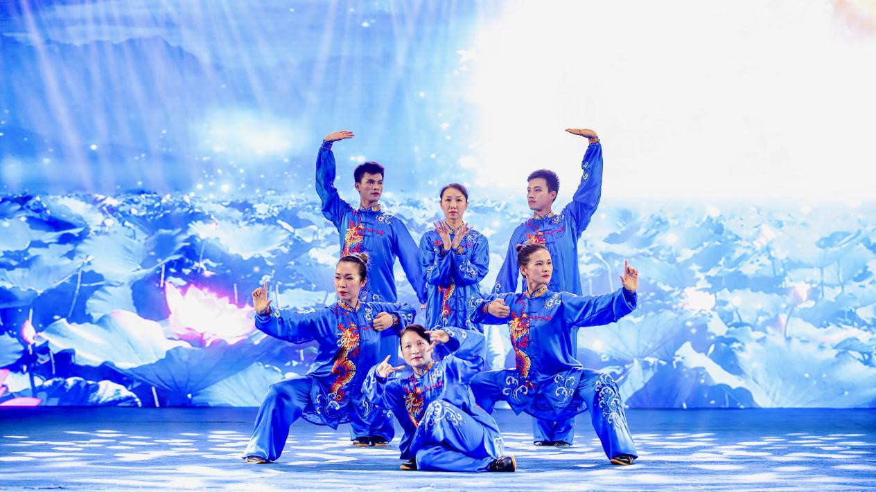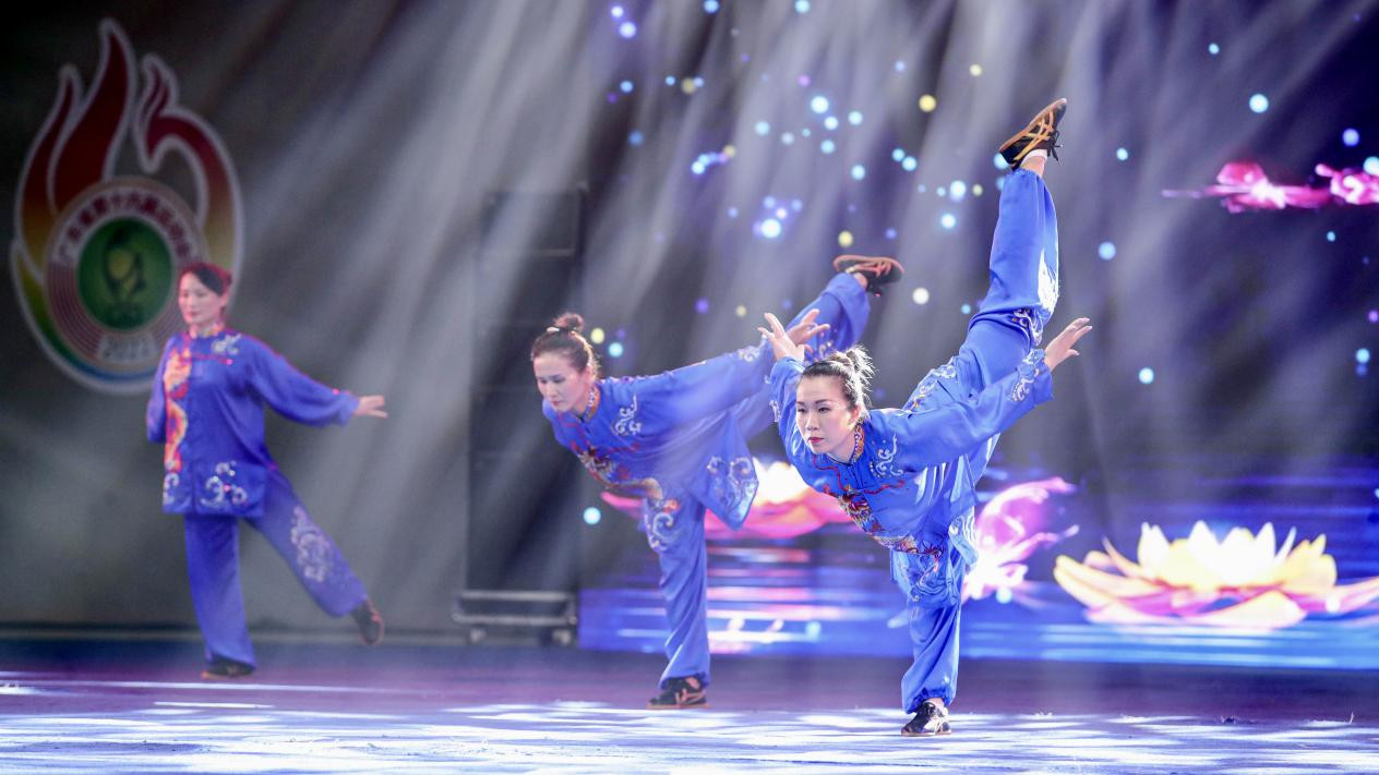 19日,易筋经、六字诀、八段锦、五禽戏集体赛在连山壮族瑶族自治县体育馆精彩上演。
