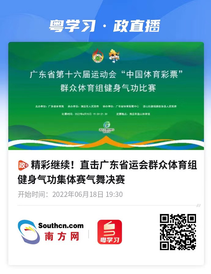 健身气功气舞是国家体育总局健身气功管理中心推出的“接地气儿”的新形式,是“倡导中华美学精神,推动美学、美德、美文相结合”的一项重要载体之一。南方网、粤学习客户端直播了本次气舞集体赛,扫码回看精彩赛事。