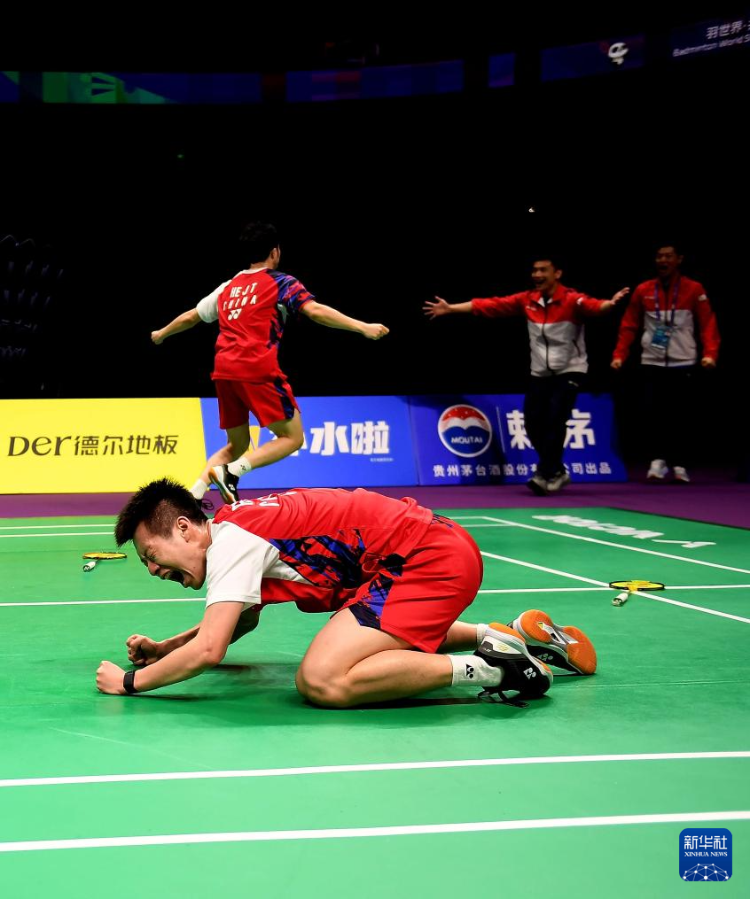 何济霆/任翔宇(前)在男子双打比赛后庆祝获胜(图/新华社)