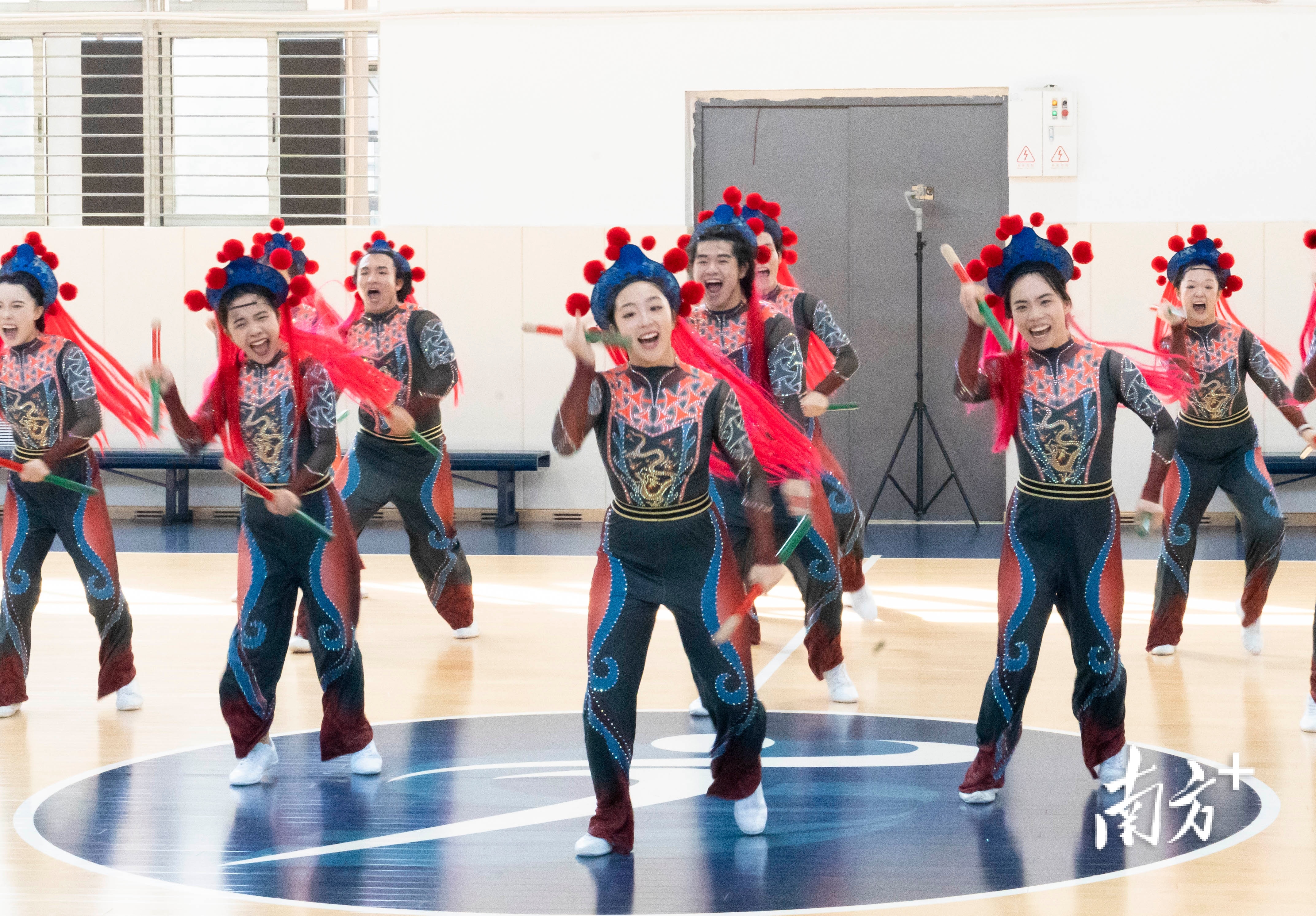 在广州体院,记者还感受到“英歌舞+健身操”之美。本次民族运动会民族健身操比赛有两个项目,分别是规定套路和自选套路。规定套路比的是动作规范和精气神,自选套路比的是创意设计和地域人文主题表达。本次民族健身操比赛每个参赛队最多可以报名参加3个项目比赛。而广东民族健身操代表队全部报满3个项目,其中融入广东潮汕地区特色、近年来“出圈”的英歌舞让人感受到岭南民间艺术和魅力。
