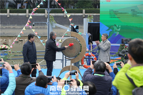 2017年南粤古驿道定向大赛总决赛(广州·黄埔古港站),国际定联秘书长TomHollowell(中)鸣锣开赛。广东省人民政府副省长许瑞生(右)、时任广东省人民政府副省长黄宁生共同见证