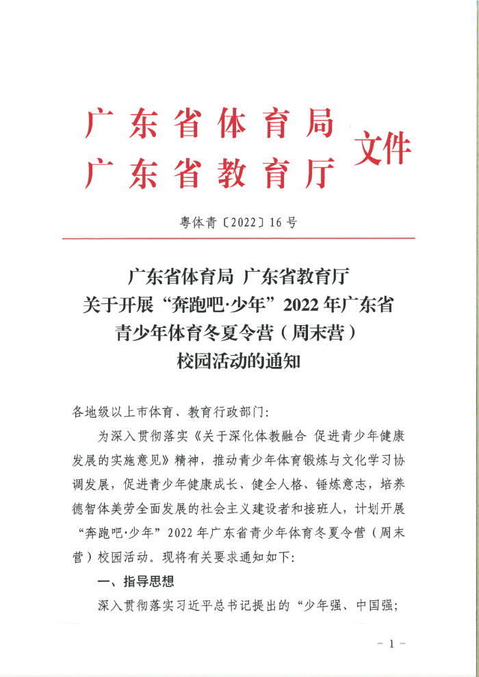 为深入贯彻落实习近平总书记提出的“少年强则中国强,体育强则中国强”重要指示精神,“奔跑吧·少年”2022年广东省青少年体育冬夏令营(周末营)校园活动将选择寒暑假或周末课余时间,于校园内开展纯公益体育运动项目技能培训活动,增强青少年参与体育运动的兴趣,让孩子们真正“动”起来。