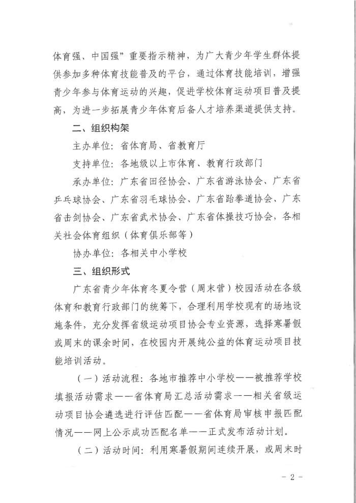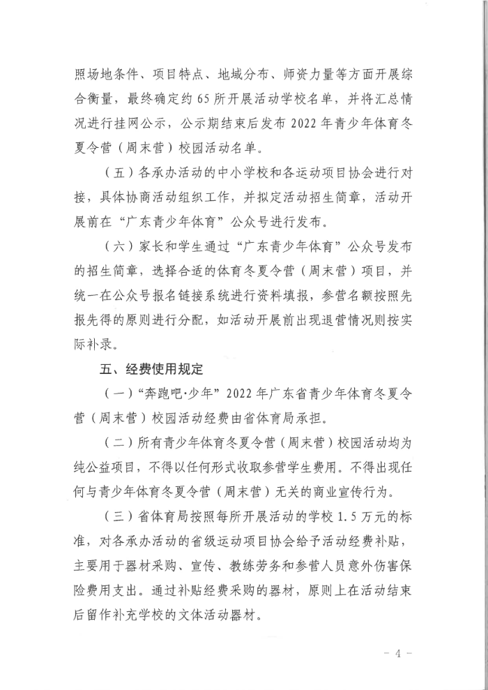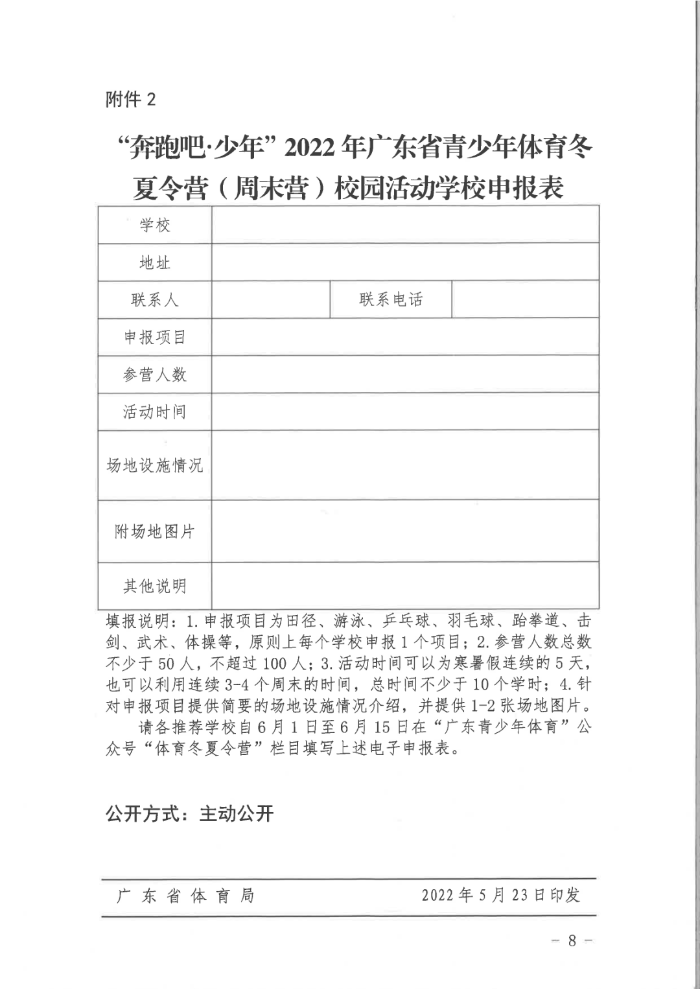 2022年广东省青少年体育冬夏令营(周末营)校园活动沿用公开申报模式,各地推荐的中小学校(需具备开展相关运动项目活动的场地设施条件)根据实际需求进行申报。
