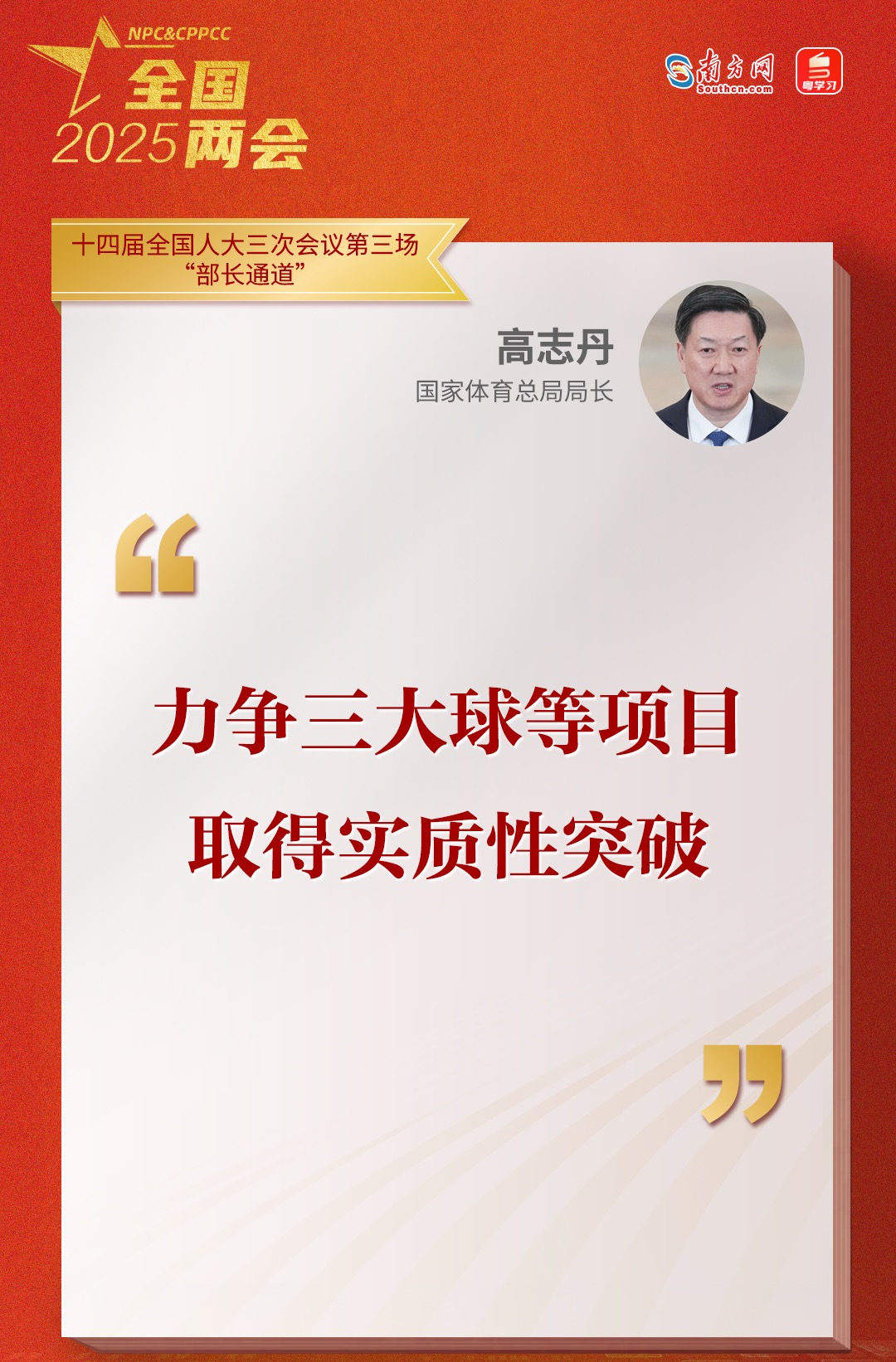 3月11日,十四届全国人大三次会议第三场“部长通道”集中采访活动举行。在回答记者关于下一步体育工作重点的提问时,国家体育总局局长高志丹介绍,巴黎奥运会上,我国体育健儿取得了境外参赛最好成绩,充分彰显了新时代中国精神、中国力量、中国形象。我们不仅要在竞技体育领域奋勇争先、为国争光,更要发挥好体育的多元价值和功能,服务人民健康、惠及经济社会和民生。锚定2035年建成体育强国的奋斗目标,再接再厉、改革创新,谱写体育事业发展的新篇章。