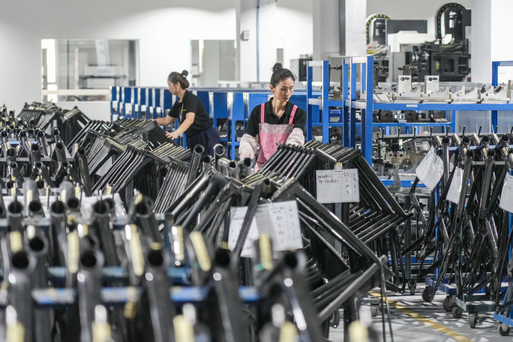 7月8日,在山东泰山瑞豹复合材料有限公司生产车间,工人在加工碳纤维自行车架。新华社记者 朱峥 摄