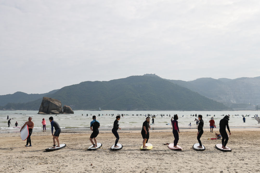 2020年12月25日,游客在后海村皇后湾沙滩上学习冲浪基本动作。近年来,三亚不断推进热带滨海休闲度假体育旅游,冲浪、潜水、海钓、帆船、桨板等一系列新兴运动蓬勃开展,各地水上运动爱好者纷至沓来。新华社记者 张丽芸 摄
