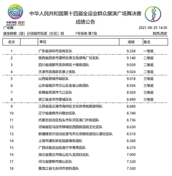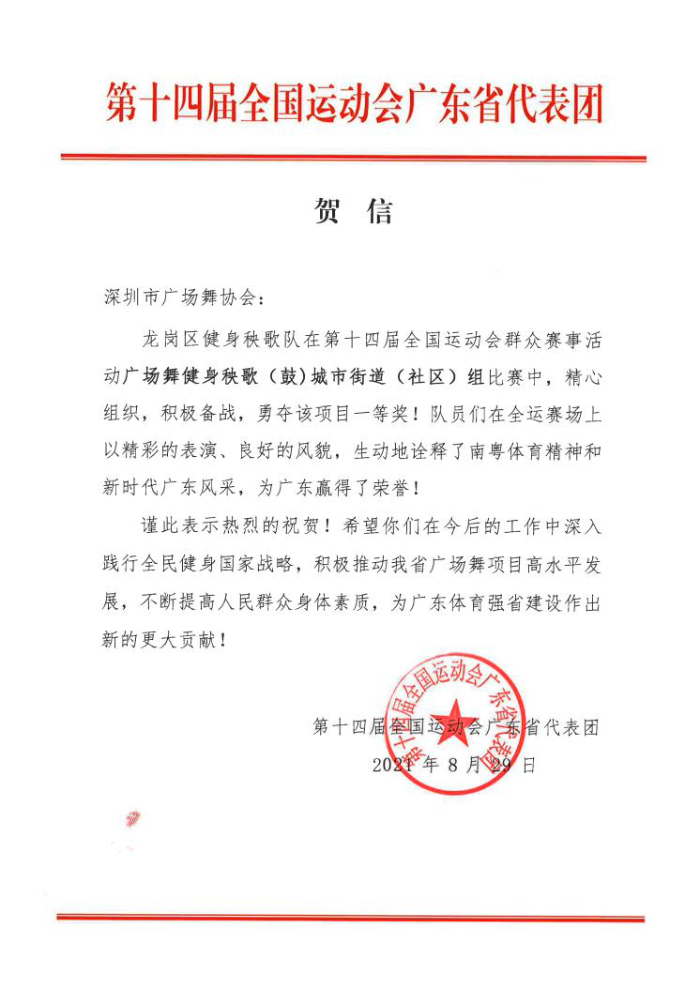 8月29日,第十四届全国运动会群众展演广场舞健身秧歌(鼓)项目公布竞赛结果,由深圳市文化广电旅游体育局和深圳市广场舞协会组织代表广东省参赛的队伍,以一套整齐划一、刚柔并济的自选套路《我的祖国》战胜了多个省市的传统秧歌强队,得到最高名次,获得了含金量十足的城市街道(社区)组一等奖。