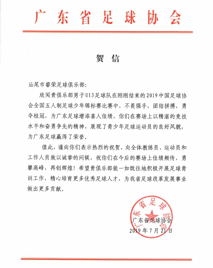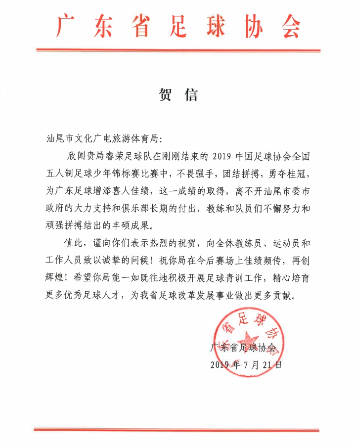 广东省足球协会分别向汕尾市文化广电旅游体育局、睿荣足球俱乐部发贺信。