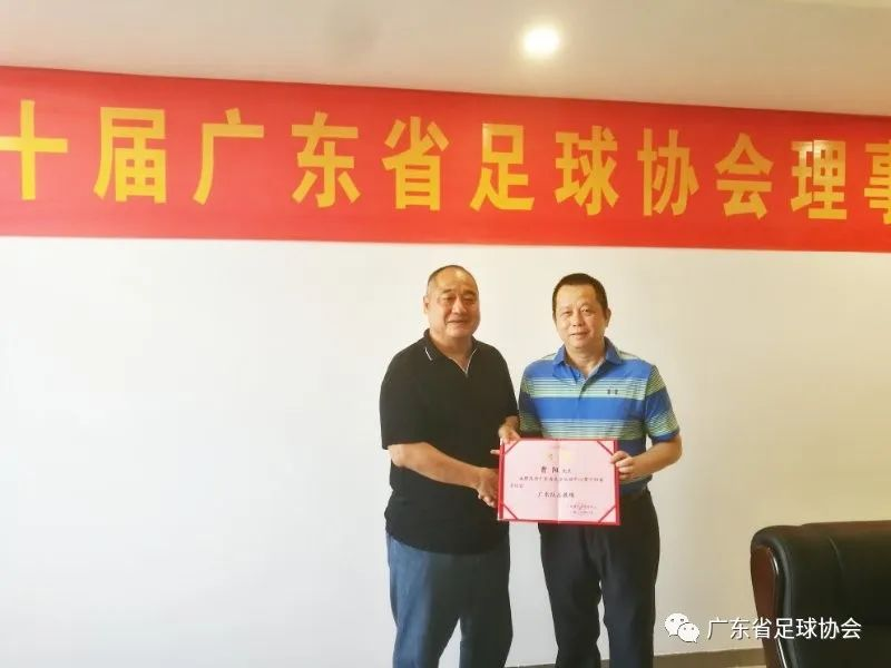 6月19日,在梅州五华横陂足球小镇召开的第十届广东省足球协会理事会第八次会议上,win007足球即时比分 副局长许建平为梅州客家足球俱乐部总经理曹阳颁发聘书,曹阳担任第十四届全运会广东足球队总教练。