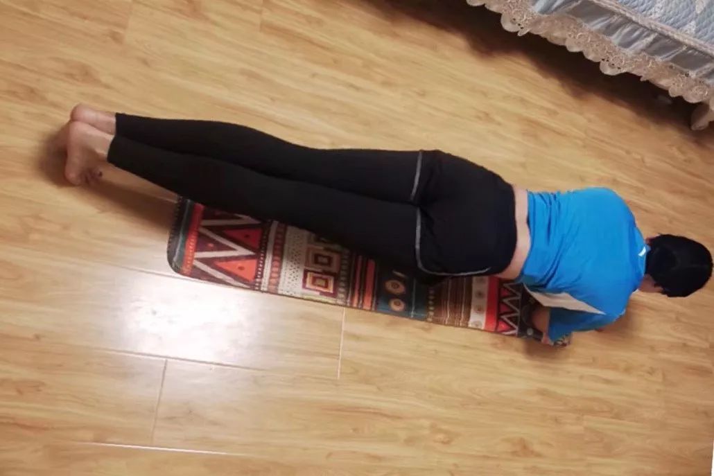 4.在床上做俯卧挺身,俯卧在床上,上体向上抬起,肚脐以上离开床面,然后还原。向上抬起时呼气,用2~4秒;向下还原吸气,用2~4秒。