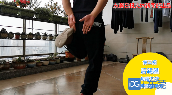 第三招:后踢腿,每组32次,后踢腿要碰到手掌