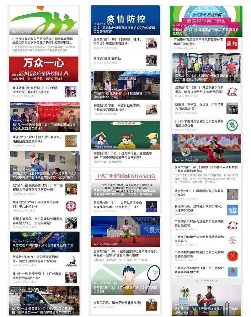 吸睛的标题、搭配贴心的内容,这是广州市体育总会公众号自2月4日起就开始每日连载的《居家战“疫”》栏目。为了让市民在家也能保持运动、强壮身体,市群众行业党委统筹全市52家市属体育协会,邀请众多世界冠军、专业教练员、运动员录制了一系列居家健身教学课程。