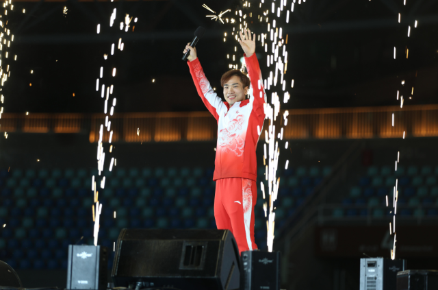 率先亮相的两位明星运动员是在群众比赛轮滑项目决赛过桩项目中分获冠、亚军的李佳瑞和冯瑞哲。当二位小将上台时,现场观众汤先生连忙把儿子扛到了肩上。他说:“我儿子从三岁开始练轮滑。台上两位哥哥参加决赛时,他就在电视机前收看转播。全运冠军公园能把他的偶像请到现场,实在是一大惊喜。”全运冠军公园将轮滑项目等群众比赛的参赛选手请到现场,以此生动诠释了“全民全运、全运惠民”的赛事特色。