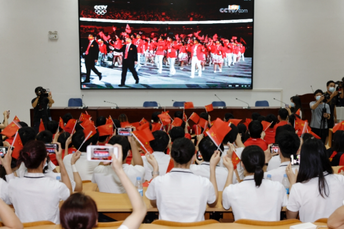 不过随着各代表团运动员们的入场,健儿们的朝气为现场恢复了奥运会应有的活力与动感。值得一提的是,南都记者是在广东省二沙体育训练中心现场与广东省队的师生们一起观看东京奥运开幕式,当中国代表团第108个出场时,现场师生们都非常激动。