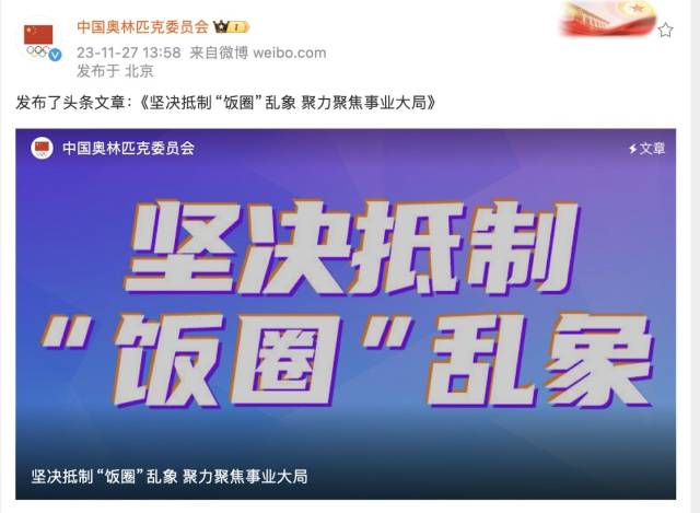 11月27日,国家体育总局、中国奥委会相继转载文章《坚决抵制“饭圈”乱象 聚力聚焦事业大局》,谈及近来一再上演的“饭圈”乱象向体育领域蔓延和渗透的现象。