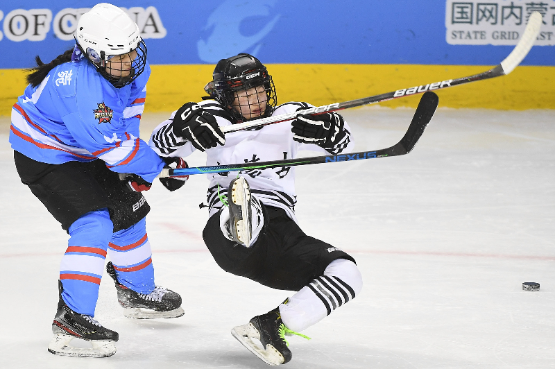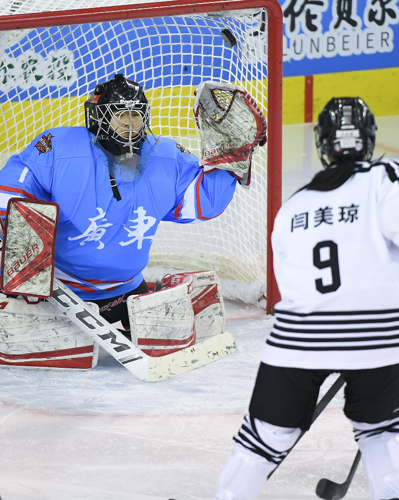 2月21日,在第十四届全国冬季运动会女子冰球(青年组)比赛中,广东队5比4逆转战胜东道主内蒙古队,进入淘汰赛争夺。