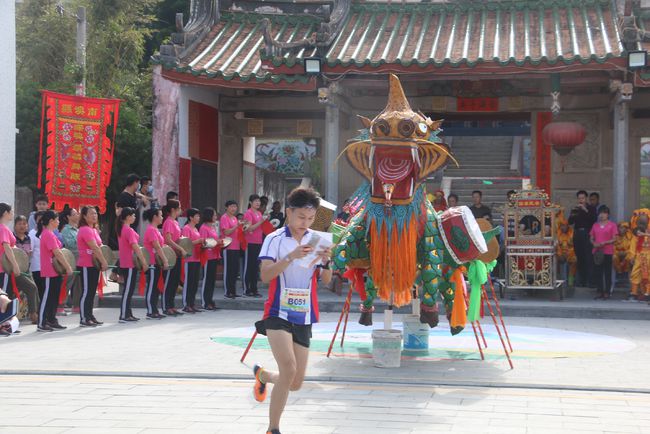 “咚咚锵,咚咚锵……”除了沿路群众呐喊助威,在城隍庙路尾的城隍庙,深澳镇的一种民间传统舞蹈——麒麟舞也为选手们助阵。深澳麒麟舞源于明代,由闽传入深澳,至今已有400多年的历史。明清时期,古城深澳镇的民众便把麒麟当成招财纳福、含仁怀义的祥瑞加以推崇,每年元宵节期间,在深澳镇的元宵庙会上,麒麟舞一上场,便吸引了十里八乡的群众前往观看,成为庙会活动的重头戏。其舞蹈氛围浓烈,动感十足,融戏曲、舞蹈、音乐、渔灯、造型等艺术风格于一身,富有地方乡土气息和海岛民俗特征。