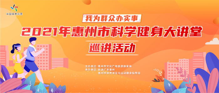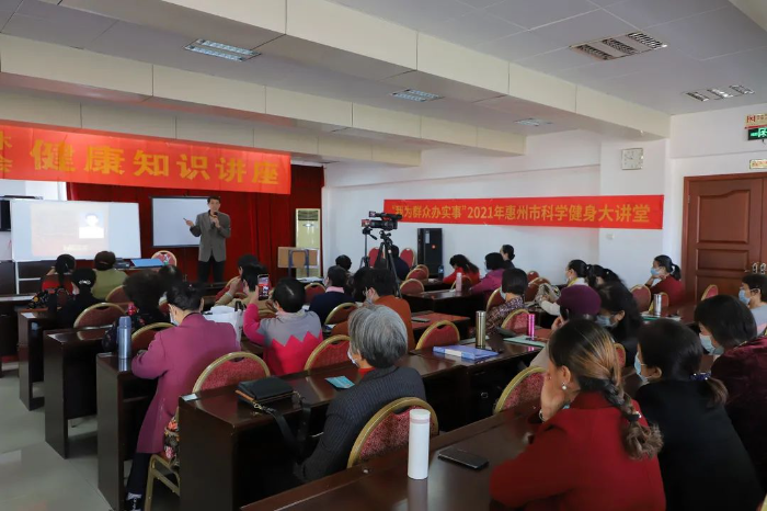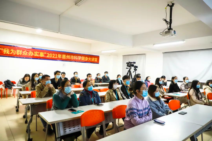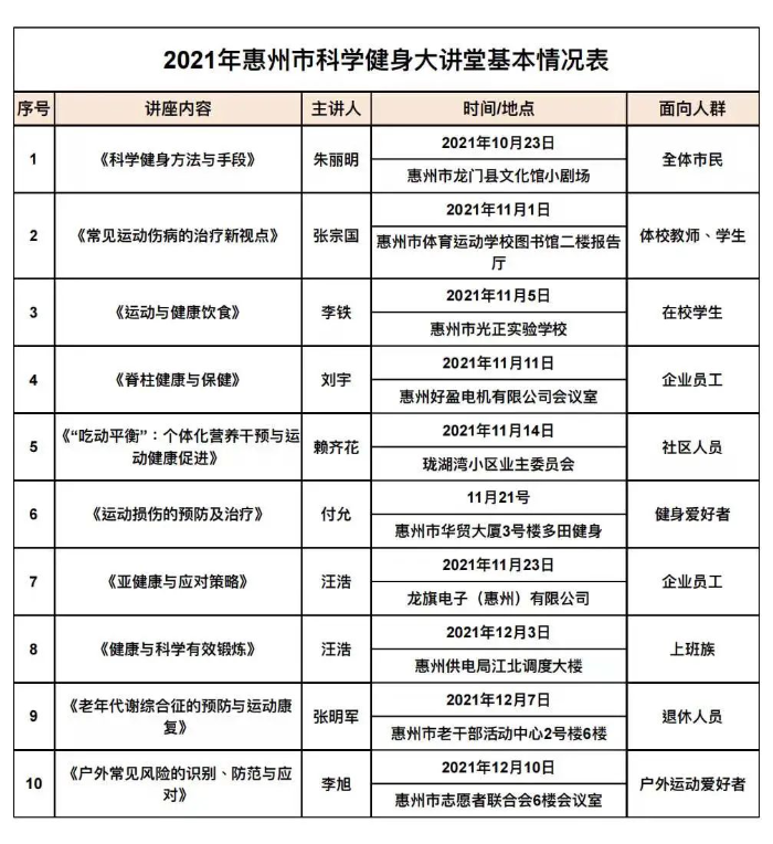 为深入贯彻落实《全民健身计划(2021-2025年)》和《广东省全民健身条例》,向全社会群众普及科学健身的知识,推动惠州市全民健身公共服务体系更加完善,结合“我为群众办实事”教育实践活动,惠州市文化广电旅游体育局于2021年10月-12月期间通过线上线下相结合的形式开展了十场科学健身大讲堂。邀请省市内知名体育健身教授、医院医生讲师,走进社区、企业、学校、有关协会等,为群众讲授科学健身知识。