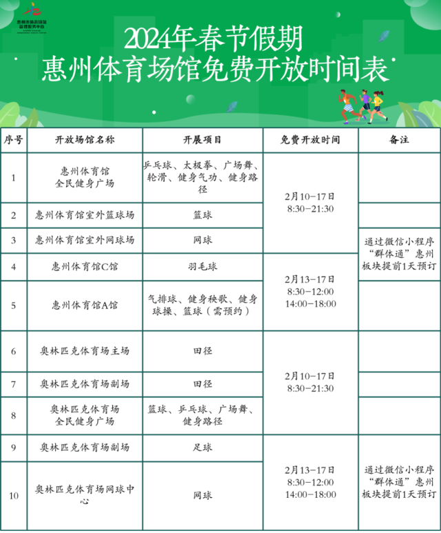 需要注意的是,惠州体育馆室内场馆、惠州奥林匹克体育场副场足球场、网球中心,2月9日18:00至2月12日(除夕18:00至年初三)暂停开放。