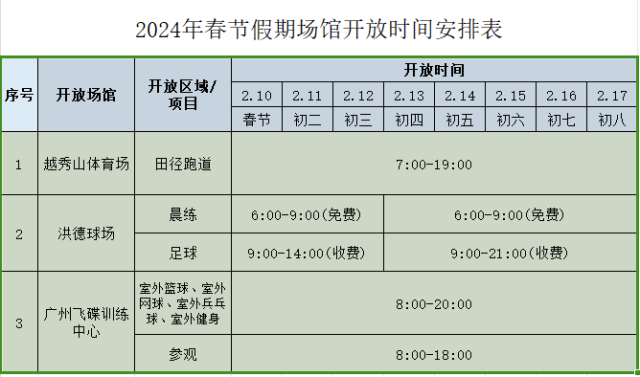 根据国务院办公厅《关于2024年部分节假日安排的通知》,结合中心工作实际,春节假期广州天河体育中心开放安排如下: