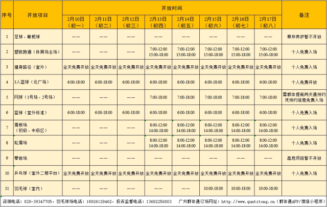 新春佳节将至,广州市全民健身中心、广州天河体育中心、广州市水上运动管理中心、广州大学城体育中心、广州市越秀山体育中心、广州体育文化博物馆等市属场馆调整了春节假期期间的开放时间。请广大市民朋友留意各场馆通告,择期前往。