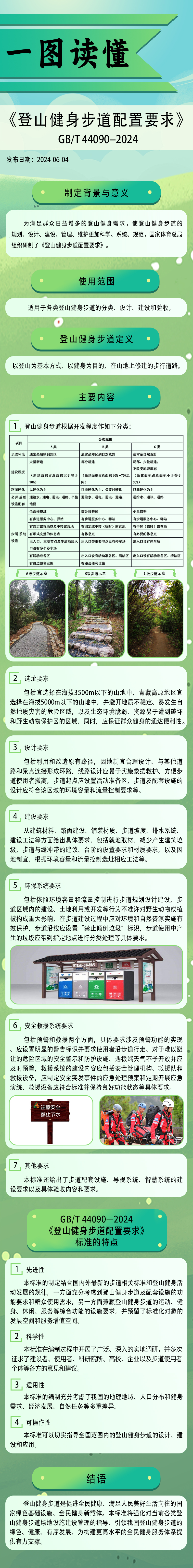 《登山健身步道配置要求》国家标准明确了登山健身步道的定义、分类,并对登山健身步道的选址、设计、建设、环保系统、安全救援系统以及配套设施等提出了具体要求。