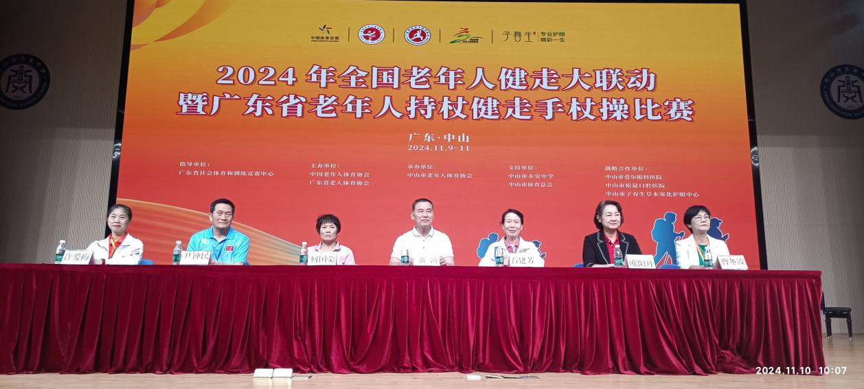 2024年全国老年人健走大联动暨广东省老年人持杖健走手杖操比赛日前在广东中山市体育场馆举行,吸引了来自广东各地的17支队伍,近200名运动员参赛。