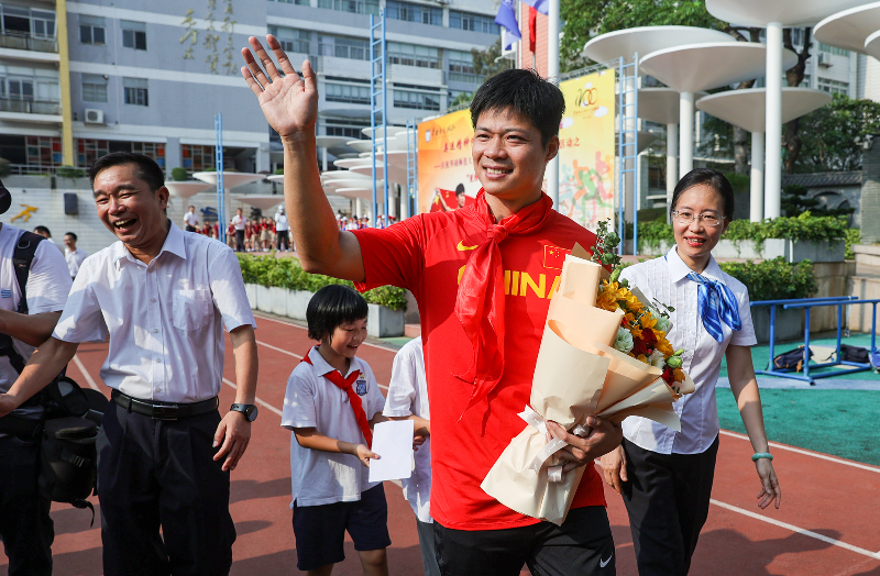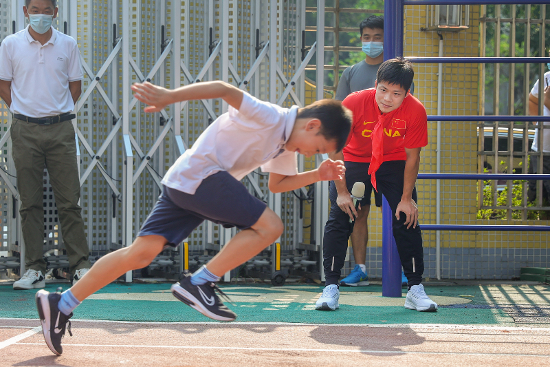 同时,苏炳添为师生们送上“大礼”,他分享了自己体育人生的“秘笈”。他表示:“很多人知道我在去年东京奥运会上跑出了9.83秒,知道我是百米‘飞人’、亚洲纪录保持者,但是很少人知道,这背后我付出了多少汗水,经历了多少次伤病,但每一次,我都克服了种种困难,从挫折中走出来,重返巅峰。在2013年莫斯科世锦赛男子100米半决赛中,我因抢跑被罚下,一度对发令枪响有了心理阴影,但我并未退缩,反而迎难而上,终于将起跑磨炼成自己的优势。通过自己一直以来在赛道上创造的成绩,找到成就感和荣誉感,这是我能坚持下来的重要原因。所以我想告诉孩子们,没有随随便便的成功,真正的好运气都藏在努力里。”