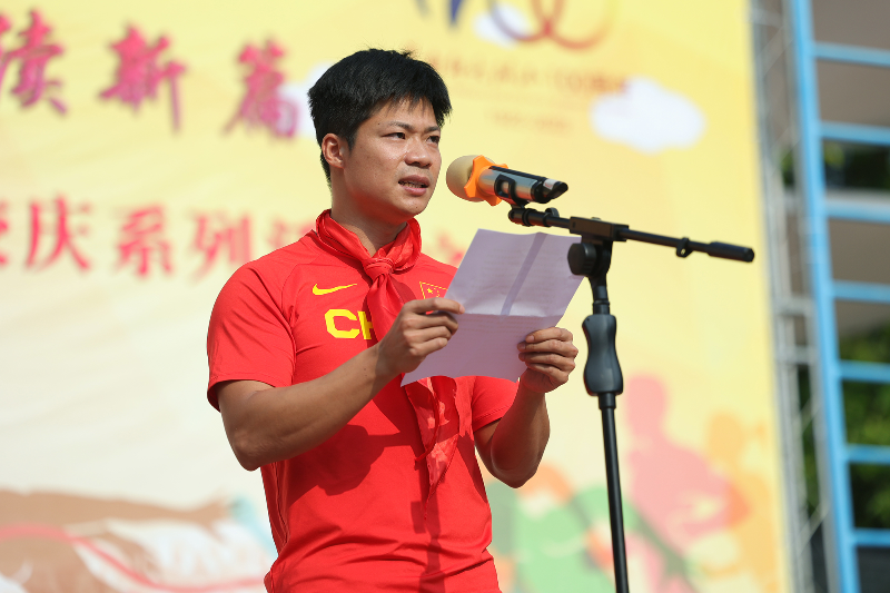 26日,苏炳添参加了学校的升旗仪式,并与师生们合影留念,学生代表为他戴红领巾、送上鲜花,他在致辞中首先向华师附小百年华诞致以热烈的祝贺,称这里不仅是教育久负盛名,他还知道华师附小田径队有着优良的传统,是广州市中小学田径项目的冠军。
