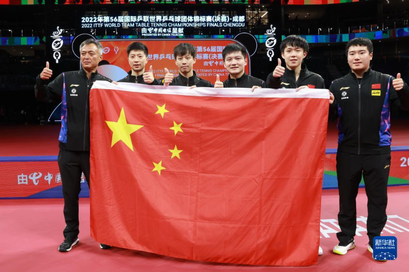 2022年世乒赛团体赛9日晚在成都收官。在男团决赛上,卫冕冠军中国男队派出樊振东、马龙、王楚钦上阵,以3比0完胜德国男队,创历史地实现男团十连冠,同时也是历史上第22次捧起男团冠军奖杯斯韦思林杯。男子世界排名第一的樊振东负责打头阵,他直落三局击败对手杜达。大满贯马龙在第二场以3比1战胜对手邱党,王楚钦第三场锁定胜局,他以3比0轻松击败对手斯达姆帕。加上中国女队在8日的女团决赛上实现五连冠捧起考比伦杯,国乒在成都以双冠完美收官。2023年世乒赛单项赛将在南非德班举行。2024年世乒赛团体赛将在韩国釜山举行,届时,国乒将冲击男团十一连冠军以及女团六连冠。