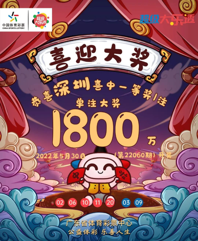 超级大乐透第22062期,1注1800万元(含800万元追加奖金)追加投注一等奖花落广东汕头。中奖彩票是一张投注额6元的2注追加单式票。