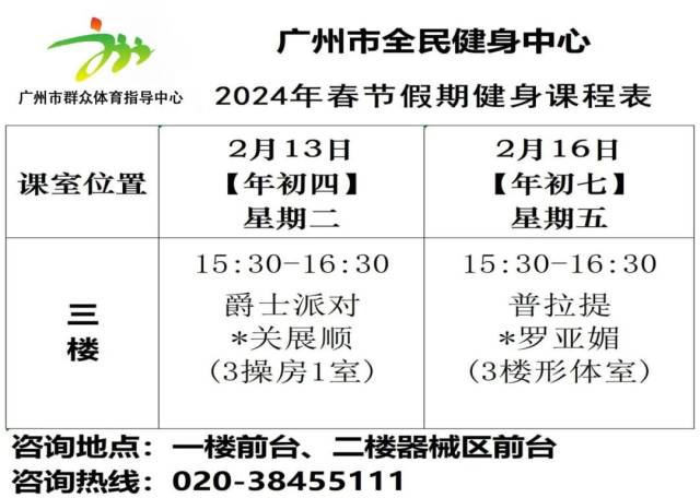 详见《2024年春节假期健身课程表》: