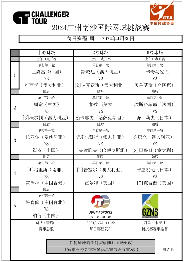 4月30日,男单第一轮全面开打,崔杰将挑战爱沙尼亚选手拉亚尔,王嘉基对阵澳大利亚球员雅西卡,中国香港名将黄泽林挑战赛会4号种子哈里斯,柏衍则与中国台北好手许育修展开“海峡德比”。