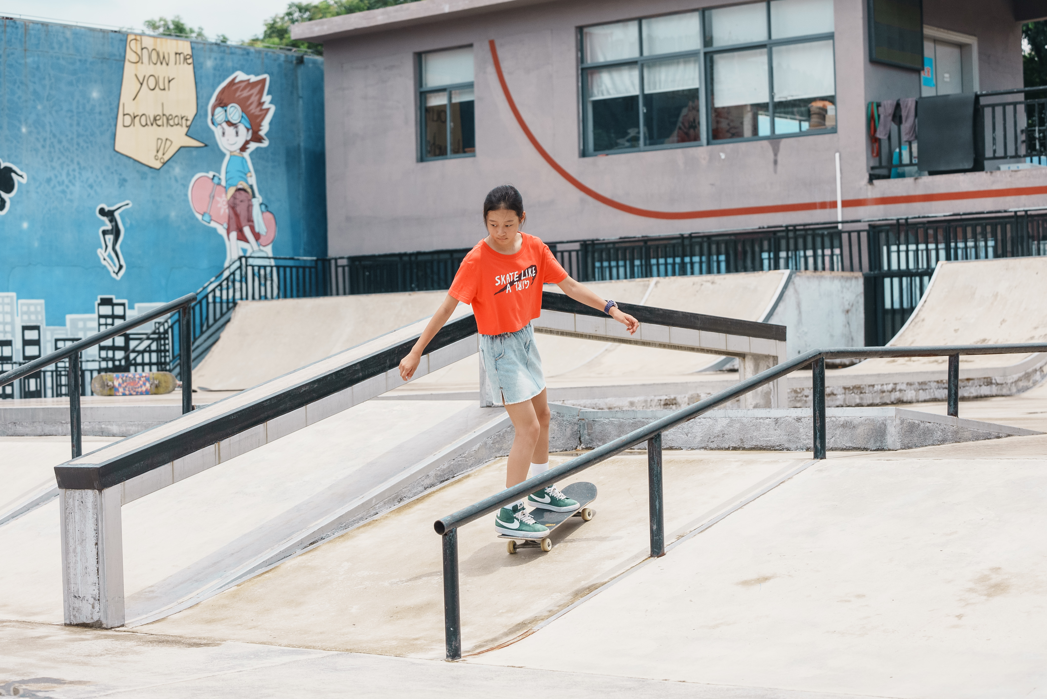 “我是偶然接触到滑板的,上脚滑行之后觉得好酷啊,感觉自己飞起来了,越滑越上瘾。”9月将上初三的男生程宇枫,从去年开始学滑板,平常周末才有时间练习,最近放暑假,于是每天晚上都会来滨江公园“练招”。