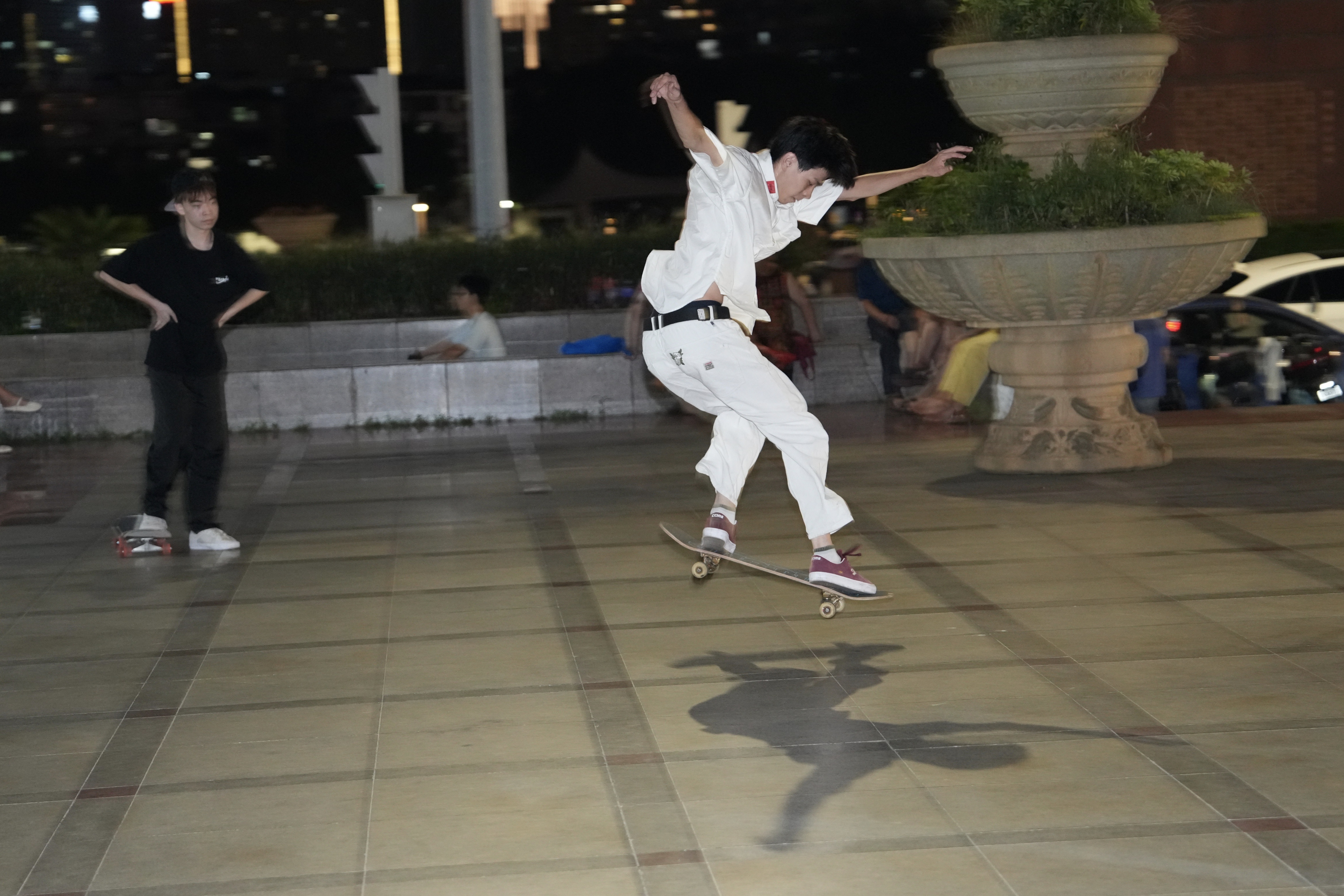 惠州滨江公园广场一侧的开阔空地,是滑板爱好者们享受自由与刺激的乐园。