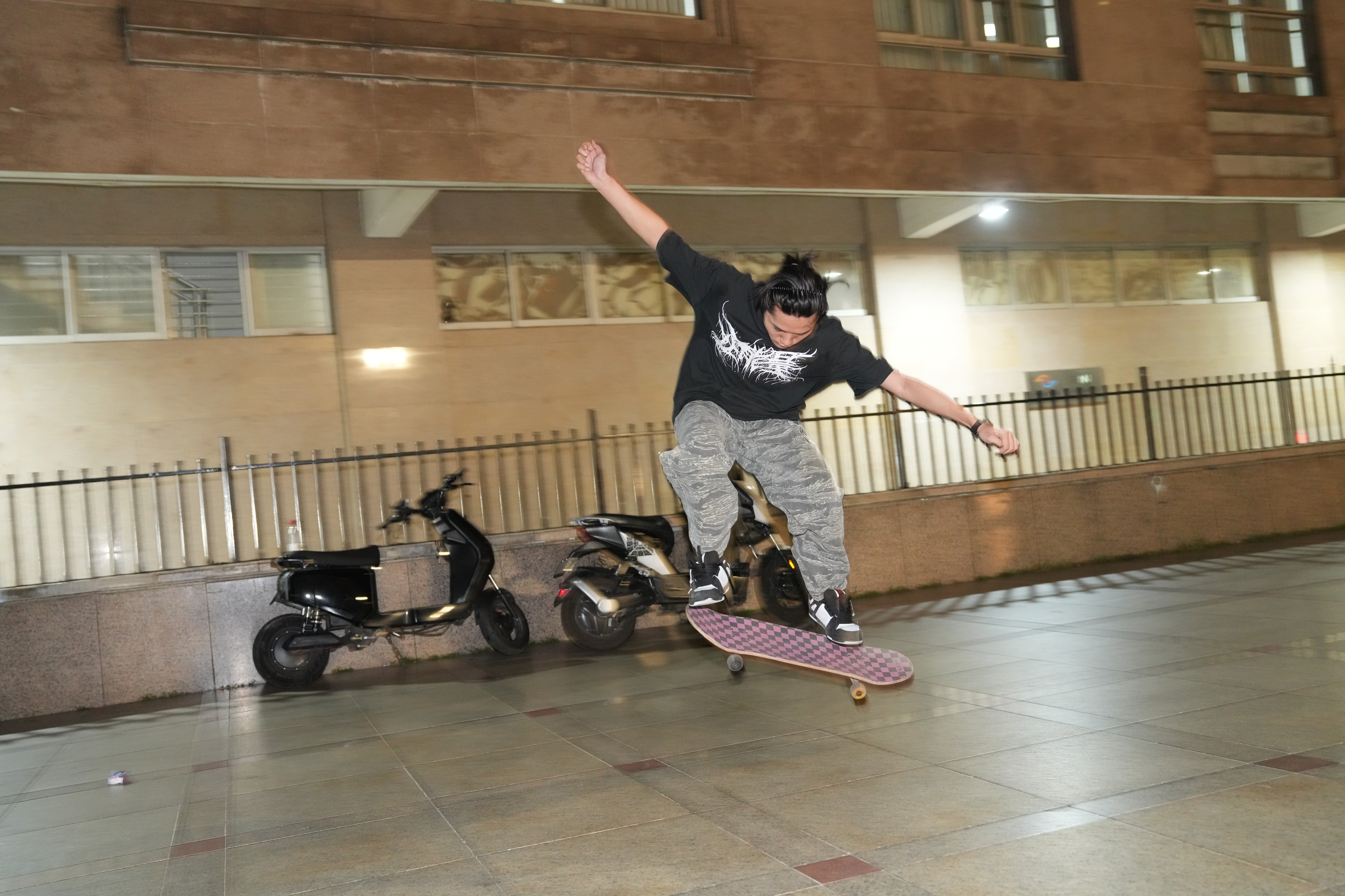 豚跳、横刹、尖翻……夜幕降临,他们开始向这里聚集,脚踩滑板就开始练习新动作,失败后拎起滑板再来,如此重复再重复,不一会儿就汗流浃背。