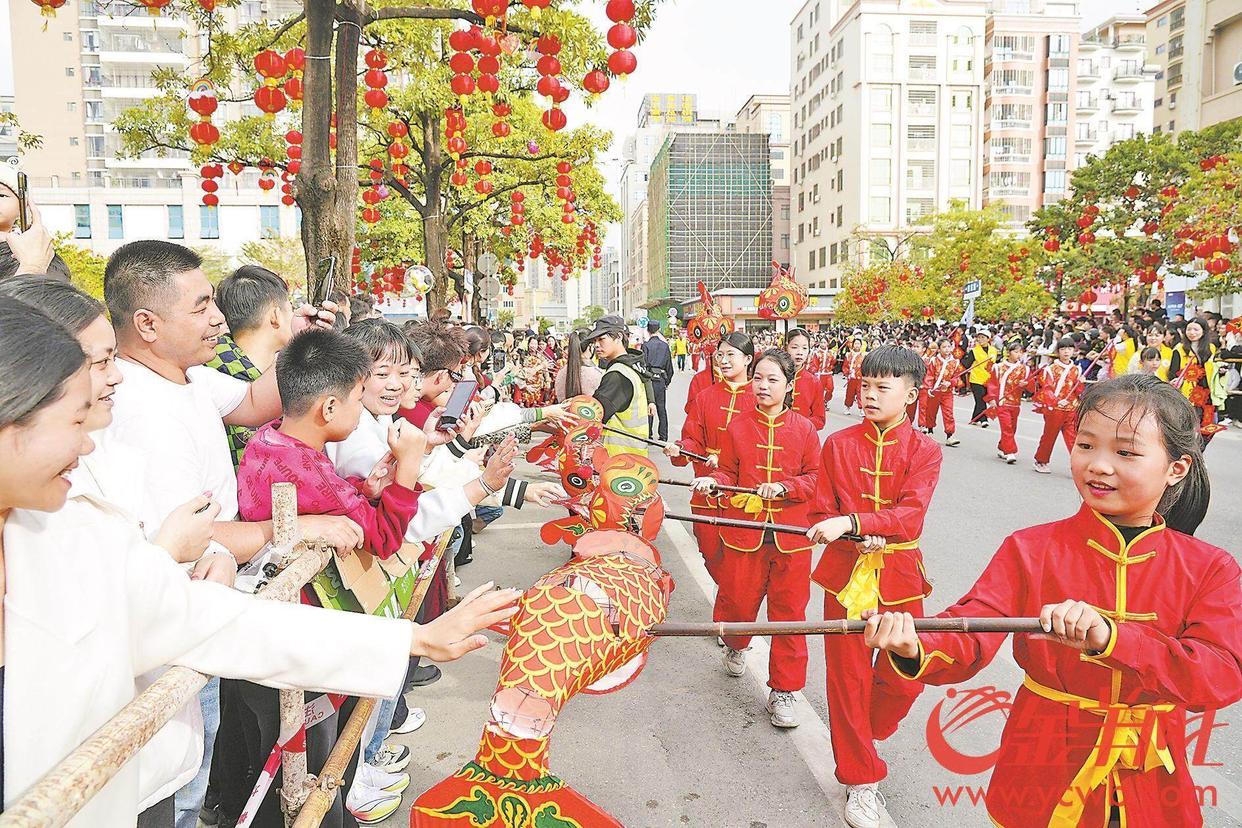 当天下午,由省级非遗保护项目“高脚狮”和多项市级、区级非遗保护项目组成的表演队伍从电城镇政府出发巡游表演,巡游队伍所到之处,欢呼声、叫好声此起彼伏,巡游路线两边街道挤满了围观的群众,不少市民拿起手机拍照打卡,记录下精彩的瞬间。活动还通过直播,将浓浓的年味和精彩的非遗表演传到更远的地方。