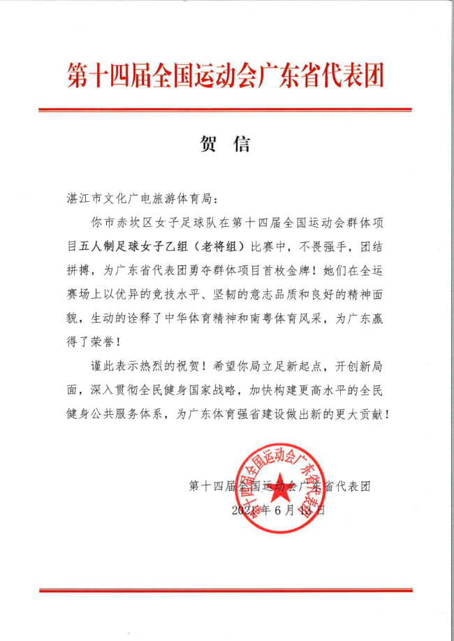 比赛结束后,第十四届全国运动会广东省代表团分别向湛江市人民政府、湛江市文化广电旅游体育局、广东省足球协会、广东湛江锐虎足球俱乐部发去贺信,感谢球队在全运赛场上以优异的竞技水平、坚韧的意志品质和良好的精神面貌,生动地诠释了中华体育精神和南粤体育风采,为广东赢得了荣誉!