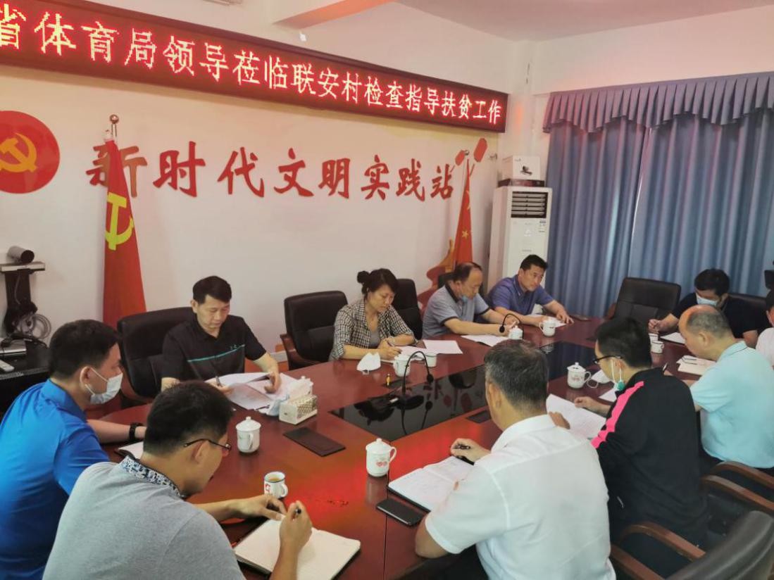 林瑛副局长带领的调研组一行充分肯定了目前的扶贫成效,林瑛要求新一届驻村扶贫组要干出特色,工作要更上一个台阶,在巩固帮扶成果的基础上,充分整合有形和无形资源,扎实抓好“三个阵地”建设,即党的组织建设、体育设施建设、体育后备人才建设。她强调要以联安村国家级运动休闲特色小镇试点项目建设为重要抓手,充分发挥体育帮扶优势,压实责任,挂牌督战,倒排工期、有力推进,确保今年建成联安足球场和新田镇全民健身中心等体育场地设施,并依托各类体育场地设施进一步加强体育后备人才建设,助力中小学校开展特色体育教育,坚决打赢脱贫攻坚收官战,为实施乡村振兴战略做出新的贡献。