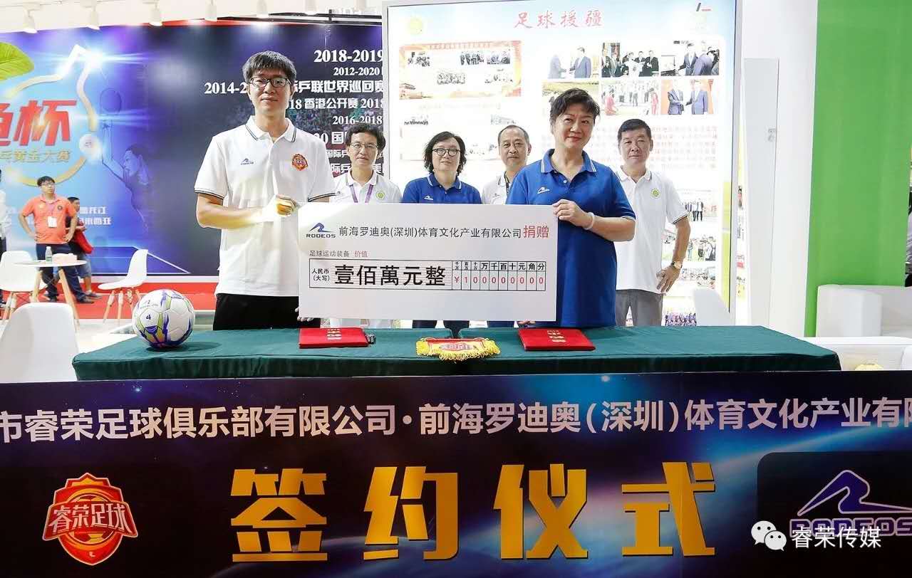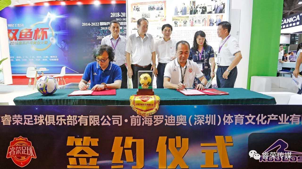 秋空蓝碧,微风送爽。9月14日,2018广东体博会在广州琶洲会展中心的保利世贸博物馆盛大举行。在本届体博会上,来自深圳的前海罗迪奥体育文化产业有限公司与汕尾睿荣足球俱乐部在win007足球即时比分 、足协的领导和参展者的见证下,举行了现场签约仪式,仪式内容主要为今后的战略合作,其中包括了罗迪奥体育文化产业有限公司向汕尾睿荣足球俱乐部捐赠价值100万元的足球运动装备。