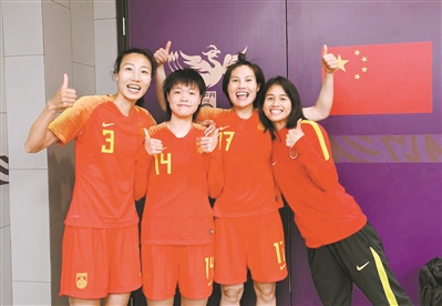 中国女足阵中4名广东球员(从左到右)林宇萍、李晴潼、罗桂平、陈巧珠赛后合影庆祝。(广东女足供图)