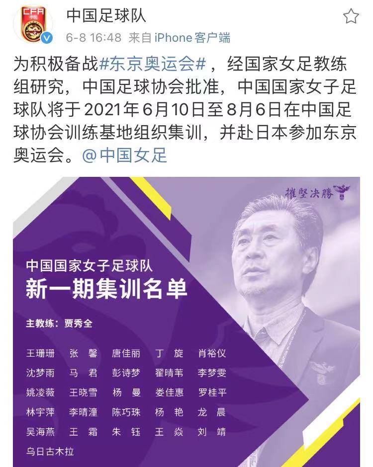 6月8日下午,中国足球协会在官网发布了《中国足球协会关于组织2021年中国国家女子足球队集训的通知》,通知称:为积极备战东京奥运会,经国家女足教练组研究,中国足球协会批准,中国国家女子足球队将于2021年6月10日至8月6日在位于香河的中国足球协会训练基地组织集训,并赴日本参加东京奥运会。