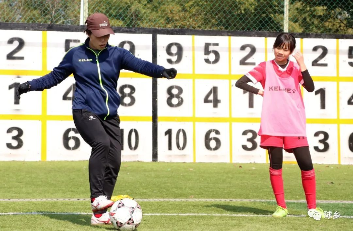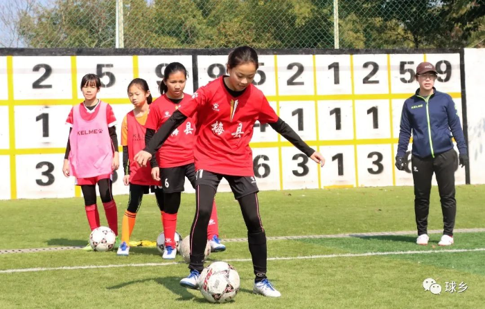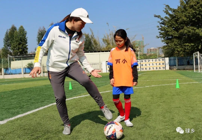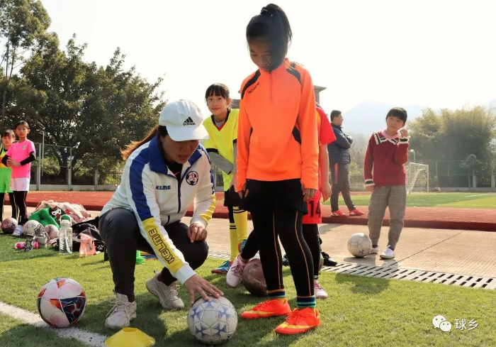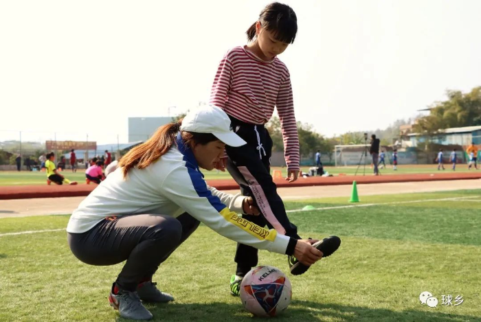 这支女足是梅县区新组建的12年龄段的女足,教练陈思佳正耐心地给小球员示范、指导。