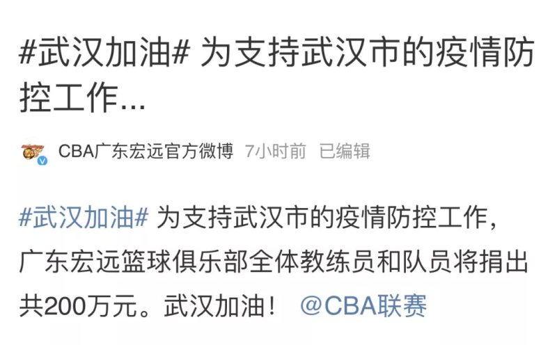 “为支持武汉市的疫情防控工作,广东宏远篮球俱乐部全体教练员和队员将捐出共200万元。武汉加油! ”