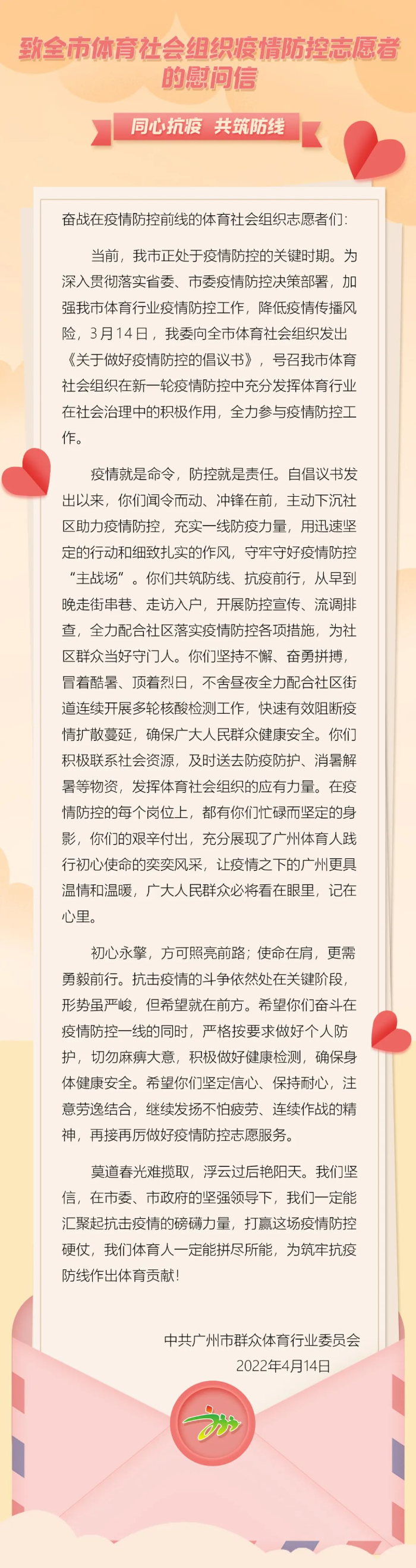 4月8日,广州出现新增本土病例后,广州市体育总会(秘书处)、广州市群众体育指导中心迅速动员组织全体干部共20人,继续分批下沉社区,深入支援越秀区东山街、梅花村街、光塔街、海珠区新港街、素社街、龙凤街、荔湾区逢源街、天河区林和街、白云区永平街等疫情防控一线,配合当地社区开展流调排查、核酸检测、维持现场秩序等工作。4月12日,根据市体育局统一部署,市体总秘书处迅速组织6名干部组成突击队,到天河区林和街华新社区支援天河区全员核酸检测。