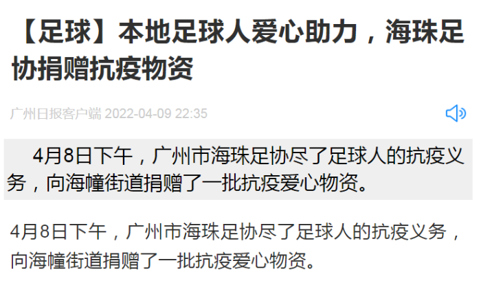 越秀区足球协会组织三家会员单位于4月12日在抗疫志愿活动中向当地社区捐赠爱心物资,为抗疫一线送去爱心和温暖,全力支持广州抗疫工作。