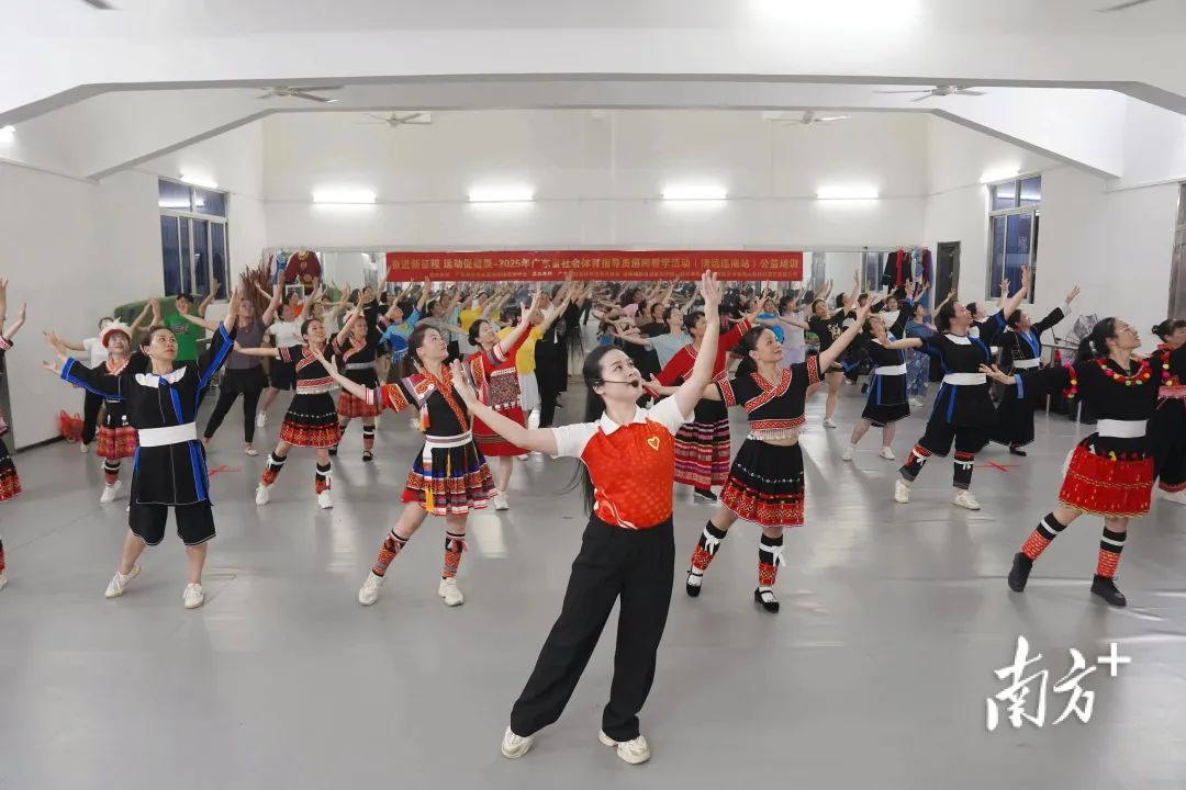 在清远连南的活动中,学员们身着民族服饰,精神饱满,随着欢快的节奏认真学习广场舞,展现了连南瑶族人民积极向上的精神风貌和对健康生活的热爱。
