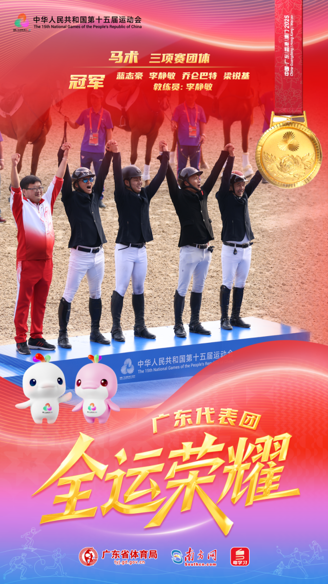 11月15日,十五运会马术三项赛在深圳光明国际马术中心收缰。由梁锐基、李静敏、乔仑巴特、蓝志豪组成的广东队发挥出色,99.5的总罚分勇夺马术三项赛团体金牌。
