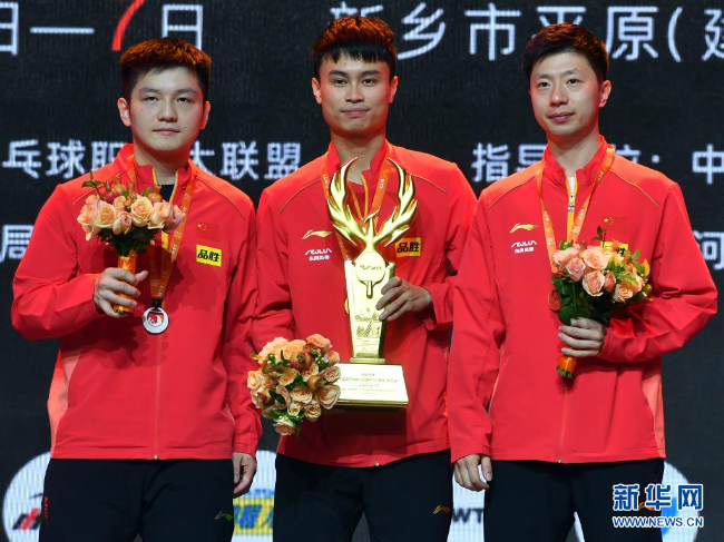 5月7日,冠军周启豪(中)、亚军樊振东(左)与季军马龙在颁奖仪式上(新华社记者 李嘉南 摄)